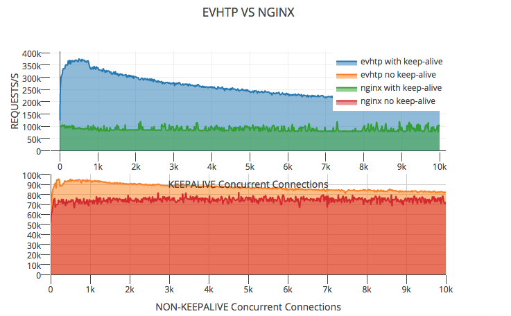 While we never documented any benchmark publically, the popular open source project ZIMG did a bit of that for us.The ZIMG team decided to move away from NGINX to libevhtp for their software, and the results were pretty outstanding. Here is a graph showing their application under very high load