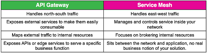A service mesh’s primary purpose is to manage internal service-to-service communication, while an API Gateway is primarily meant for external client-to-service communication.