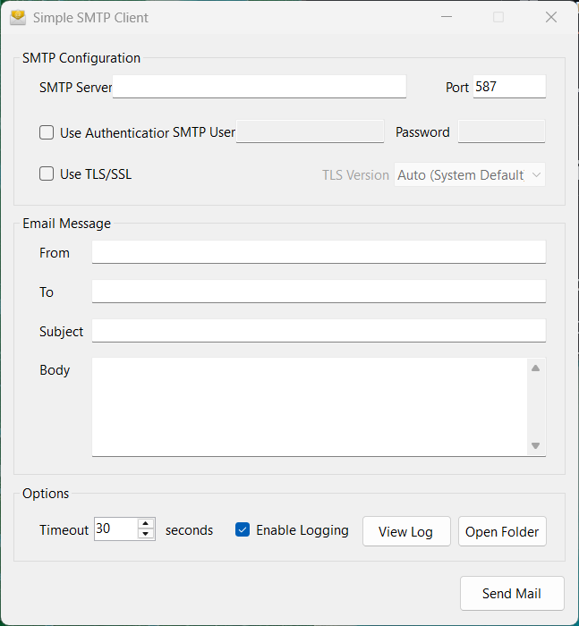 %LOCALAPPDATA%\SimpleSmtpClient\settings.json- Application settingsLogs\- Daily log files