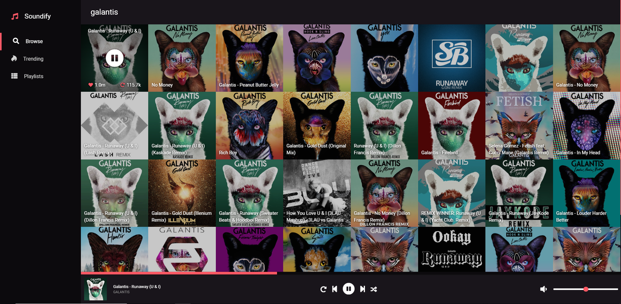 Soundify - Demo Soundify is a Soundcloud Player for the Web built using React & React Redux. Navigation Getting Started Frameworks Getting Started $ git clone https://github.com/barenddt/soundify.git $ cd ./soundify $ yarn $ yarn client Frameworks React Redux React-redux soundcloud-v2-api