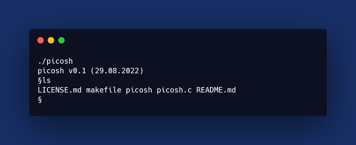 gcc picosh.c -o picosh./picosh| Name | Name | Last commit date | ||