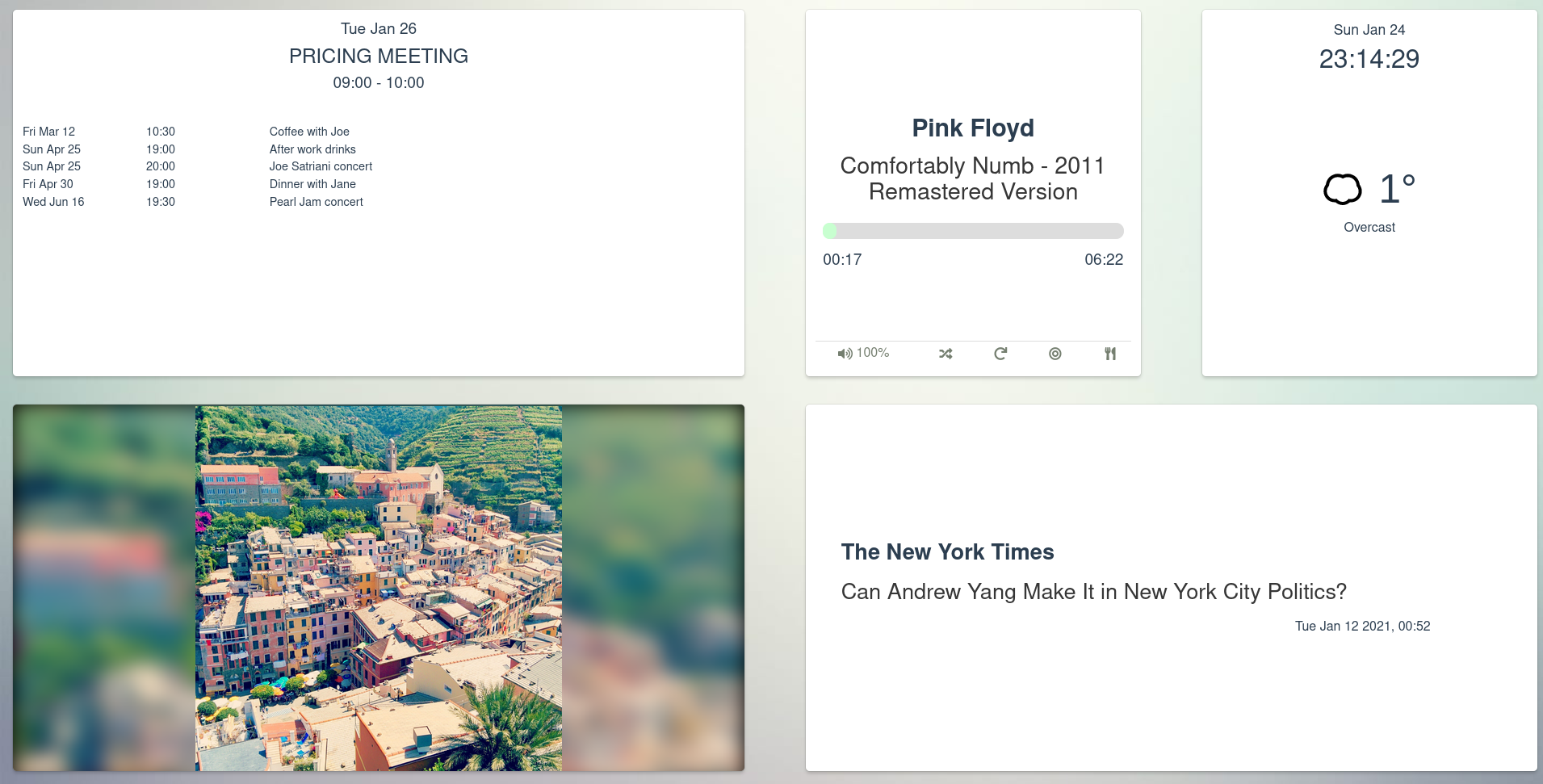- Build your own web dashboard with calendar, weather, news and music controls (basically, anything that has a Platypush web widget)