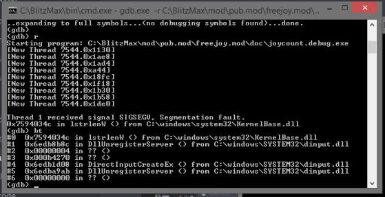 - start application without joypad attached: works until you connect/disconnect/connect/... the joypad, it then randomly receives an "EAV" (crash) - outside of the BlitzMax-debugger-scope.