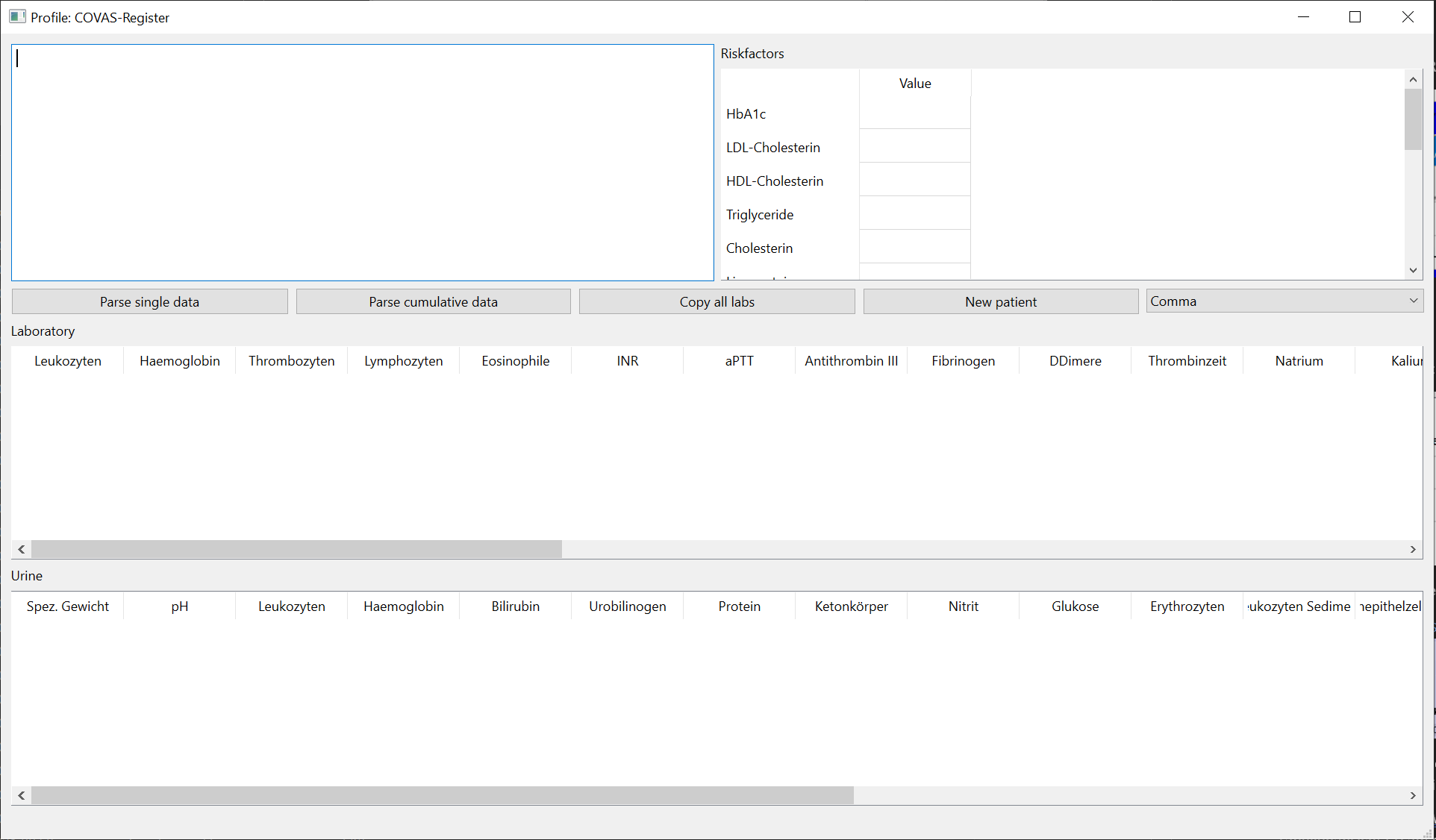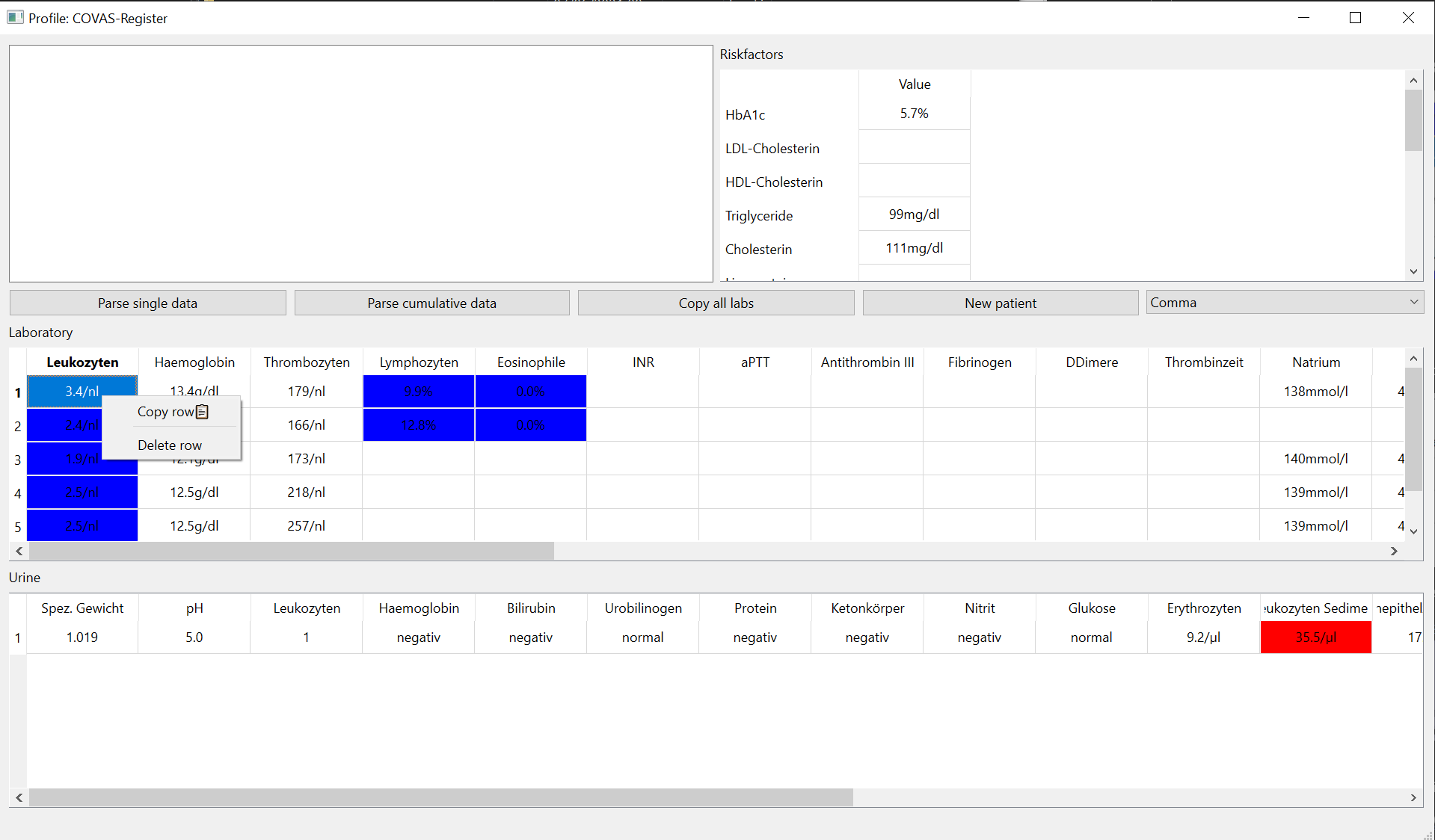 Then either press the "Parse single data" or "Parse cummulative data" button depending on whether or not you have copied data from the medico cummulative or single report view and the data will appear in your respective tables.