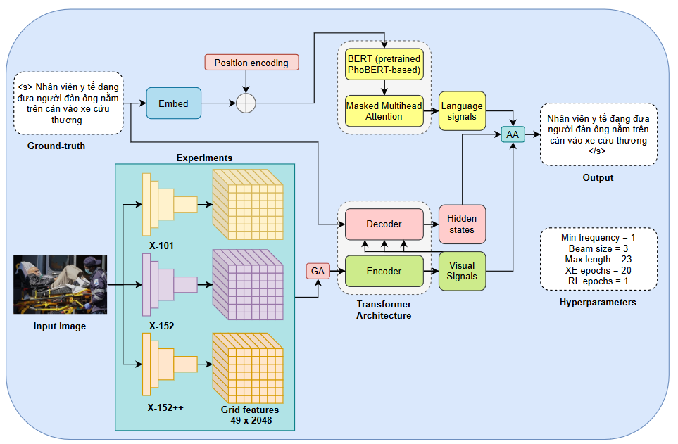 This repo GitHub contains our solution for vieCap4H Challenge 2021. In detail, we use grid features as visual presentation and pre-training a BERT-based language model from PhoBERT-based pre-trained model to obtain language presentation. Besides, we indicate a suitable schedule with the self-critical training sequence (SCST) technique to achieve the best results. Through experiments, we achieve an average of BLEU 30.3% on the public-test round and 28.9% on the private-test round, which ranks 3rd and 4th, respectively.