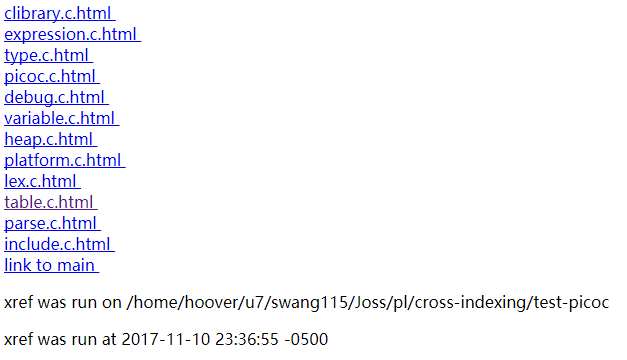 - [X] Place the HTML file(s) into a subdirectory named HTML, with an extra file index.html that contains a link to the main HTML file(s), a location-specific link to the beginning of the code for main, and information about when and where the xref tool was run.