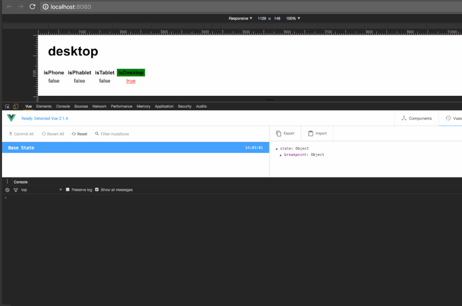 store.state.breakpoint.current // string current breakpoint e.g. 'tablet'- When BreakJS runs callbacks on breakpoint change, the store's state is updated.