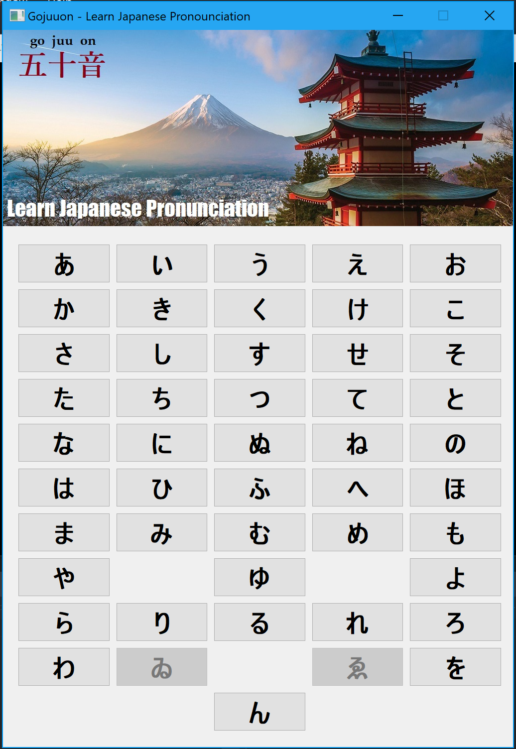Gojuuon (五十音) is a program designed to help you improve your pronunciation and give you confidence in Japanese. Single click on the alphabet to hear the Japanese pronunciation spoken by a native Japanese speaker. You can learn at your own pace.