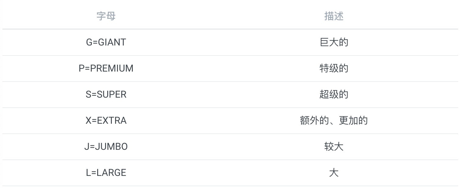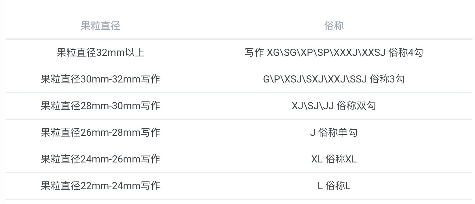 主要是按颗粒的直径大小来划分,按果粒大小一般分为:(不同公司所用标识不同,所以同一规格可能有多种字母表示)。具体如下: