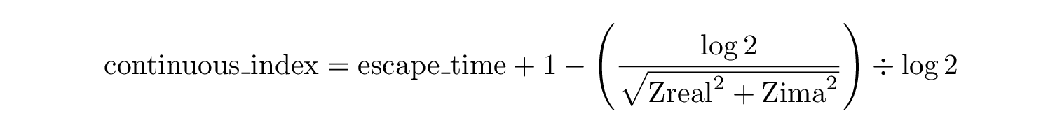 A well known method is mapping the escape time on a logarithmic scale which will give us a continuous gradient. Using a natural logarithm allows us to transform the magnitude of every escaped pixel into a value between 0 and 1. Here is the formula I use to calculate a continuous index for every complex number of the complex plane.