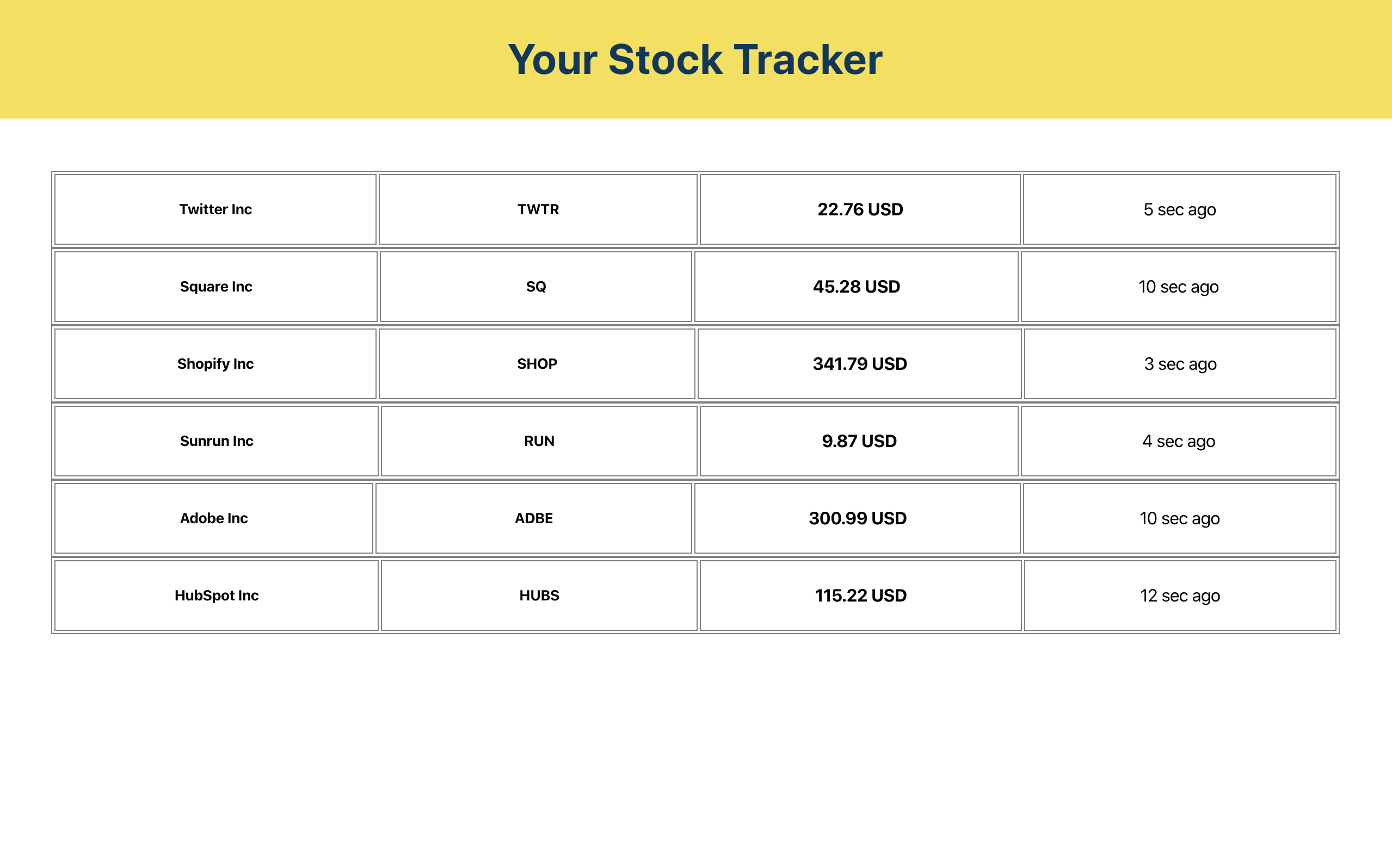 Let's consider a data set in JSON format containing financial stocks of muliple companies. This project reads the data in JSON format from an external file and render on the web page in a tabular format as shown below.