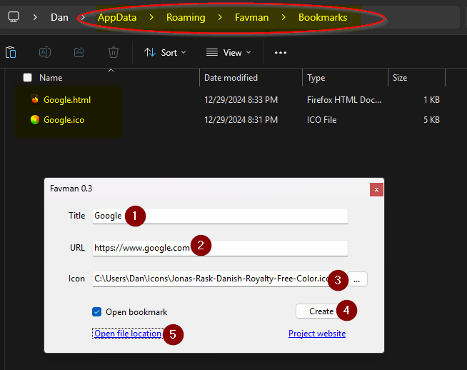 Provide a title, URL and icon file. Favman will create an HTML file with the provided information.