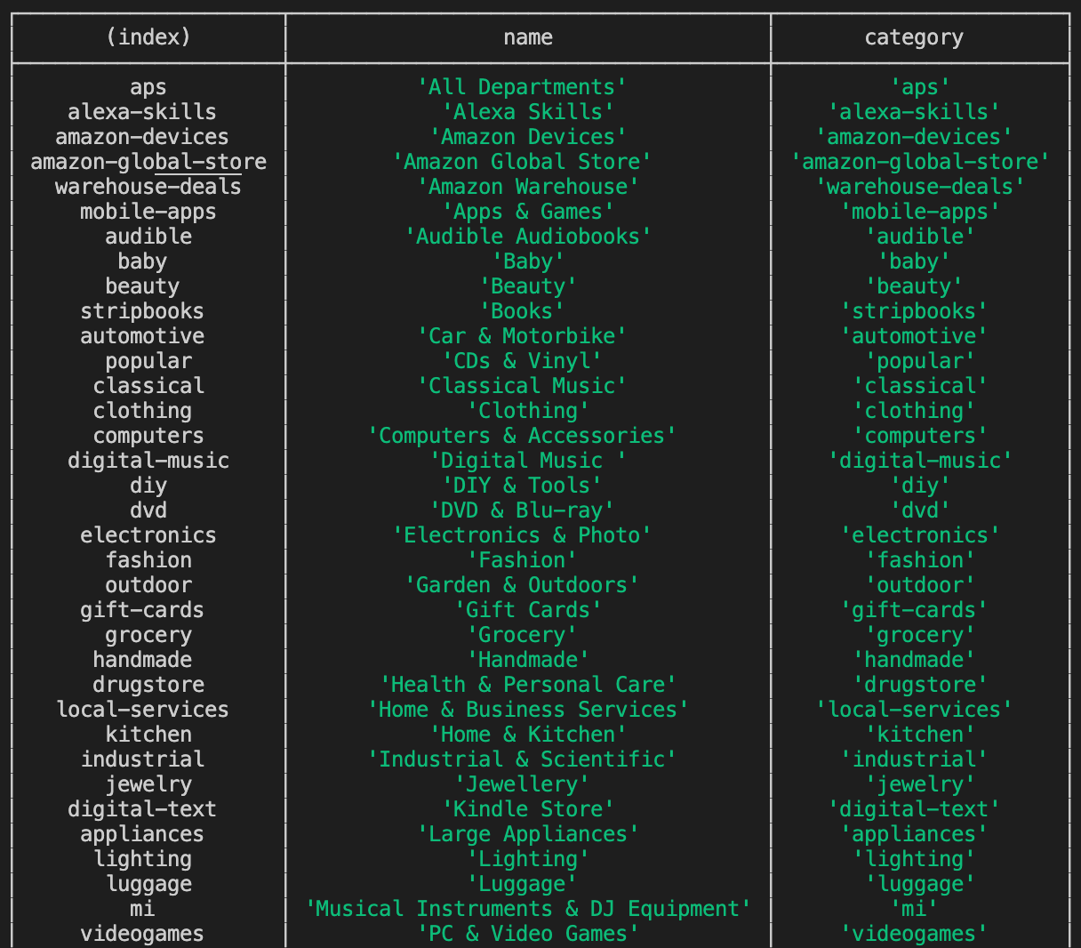 the shown table as value: amazon-buddy categories