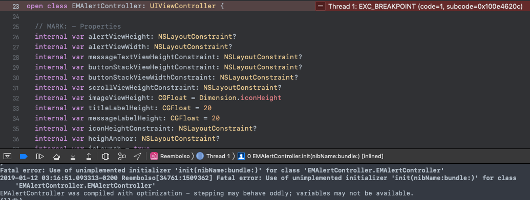 Im getting a crash on my modalViewController  Fatal error: Use of unimplemented initializer 'init(nibName:bundle:)' for class 'EMAlertController.EMAlertController'