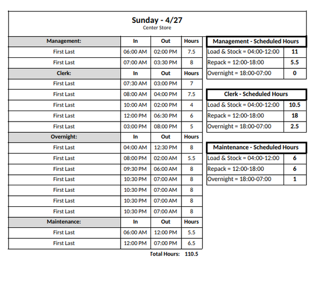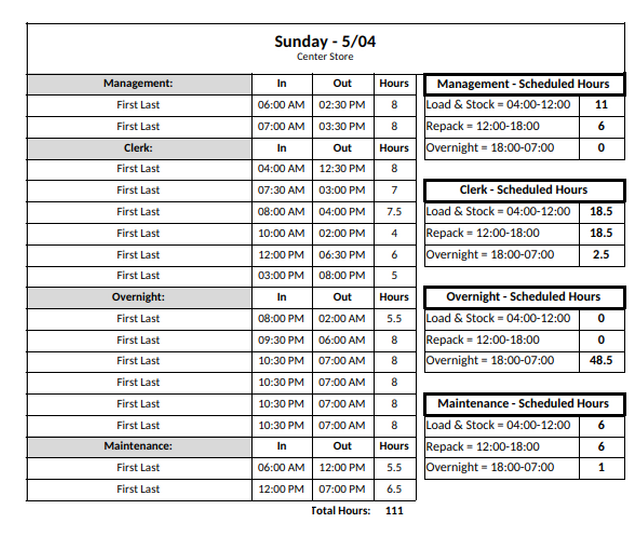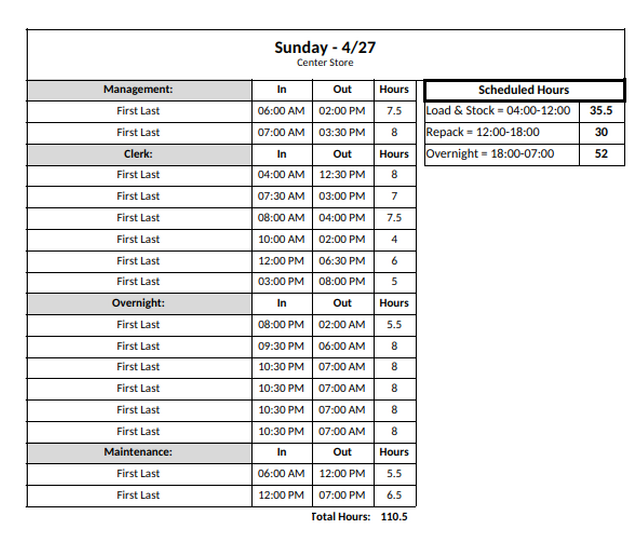The labor tracker is just a collection of all the time blocks you’ve configured shown as a table ordered by start time. They can have as many elements as you have time blocks, and will be rendered by default on a per role basis in your output. However there’s also the option to condense all the per-role labor trackers into a unified table that tracks the entire department as one unit.