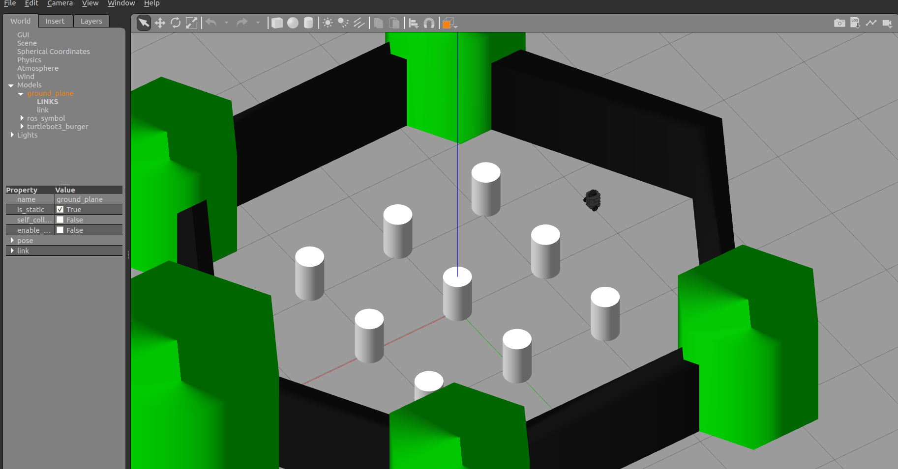 - Now, go to the insert section, top left in your gazebo screen, and insert the obstacles in the environment. Insert a large number of obstacles typically, 8-10.
