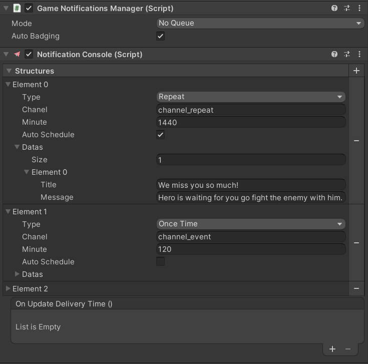 OnUpdateDeliveryTimeto use when you want to send notification one time with diffirent customMinuteeach time such as fire notification in game idle when building house completed. In case you need write your custom method to assign to event by call to API