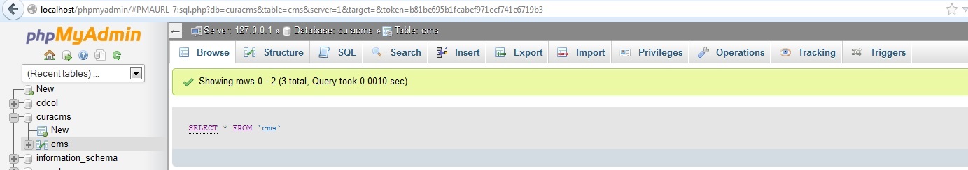 Open the database created during installation (the name of which is specified under config.php) and then open up the table "cms".
