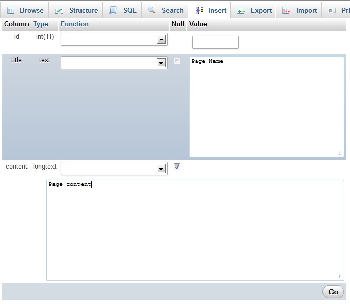 id should be left blank as it automatically will be assigned, title is the name of the page as it appears on your navigation bar, and content is the page content