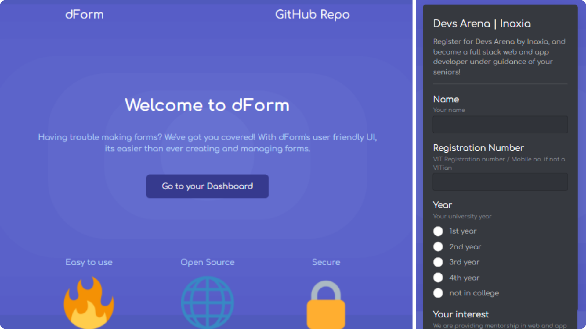 dForm is an open-source, secure way of creating and managing responses of your forms. It also gives you metrics such as times your form was viewed and submitted. dForm uses fully responsive UI similar to Discord, and Material UI, and also keeps your session secure with JWT authentication with each request!