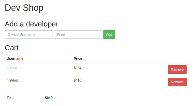 - Replace input text by a list of developers with name, photo, price and a button "Add to Cart".