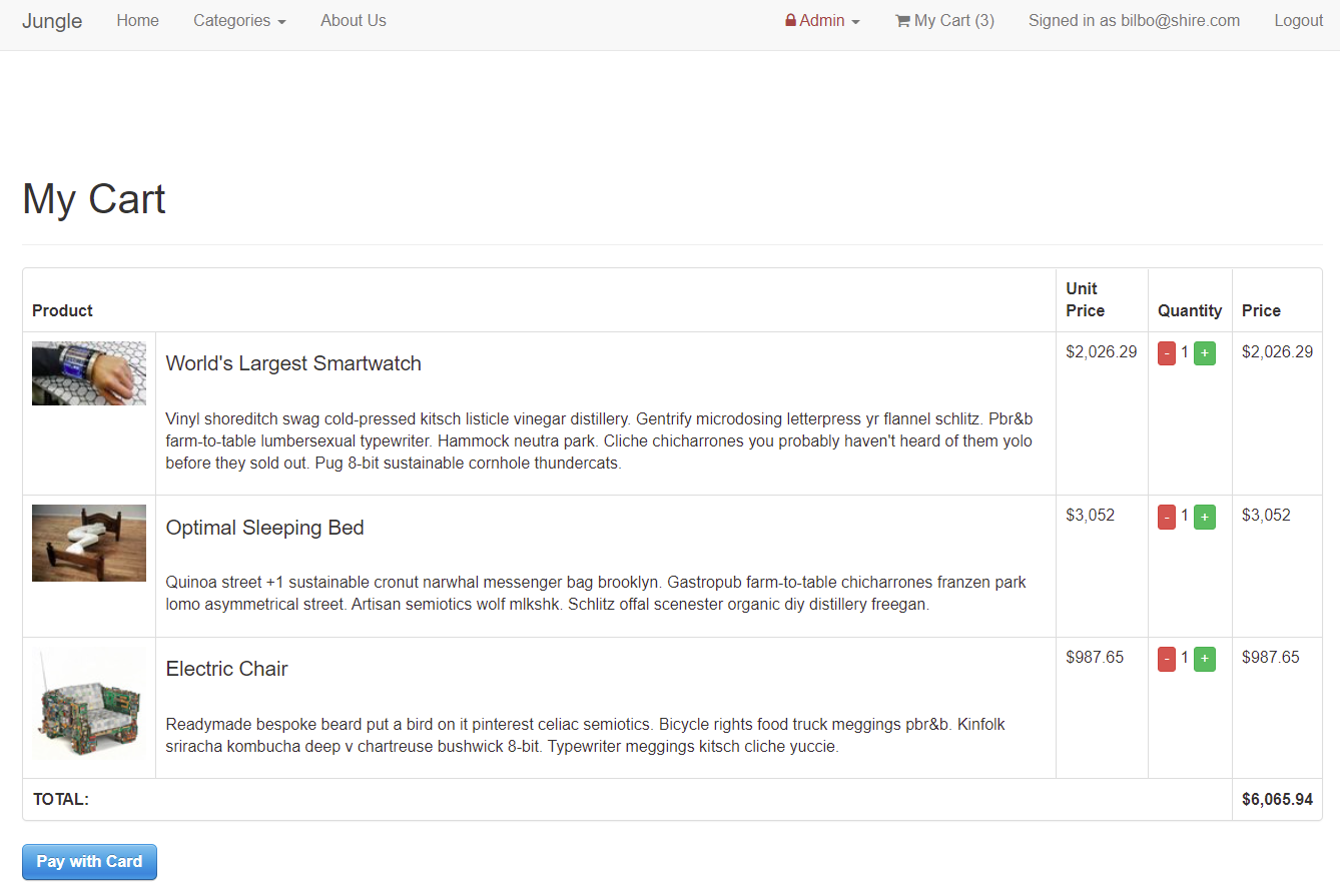 User can access their shopping cart to checkout, and are then directed to purchase items. After the transaction is complete, the user can see a summery of their order and the email the invoice is sent to.