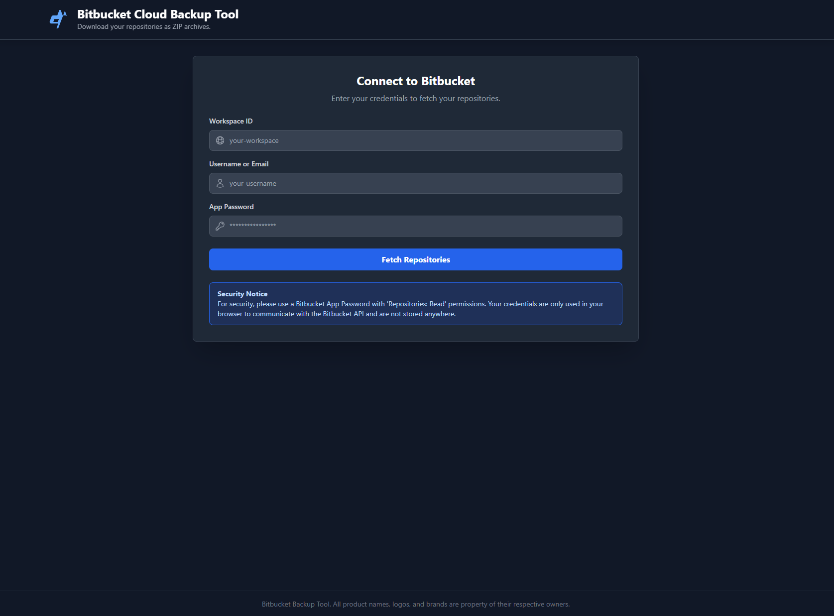 A simple yet powerful web application to connect to your Bitbucket Cloud workspace and download your repositories as ZIP archives. This tool provides an easy-to-use interface for backing up multiple repositories at once, directly from your browser.