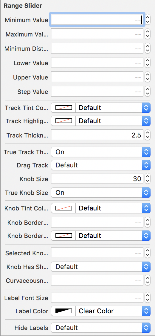 $ pod installimport SwiftRangeSliderTo use SwiftRangeSlider on a storyboard, add a UIView to your view controller and set its class to RangeSlider. The Range Slider defaults to an iOS-esque style of slider, but it can be modified to look lots of different ways! There is even scaling on touch and labels, so be sure to experiment until you find exactly what you like!