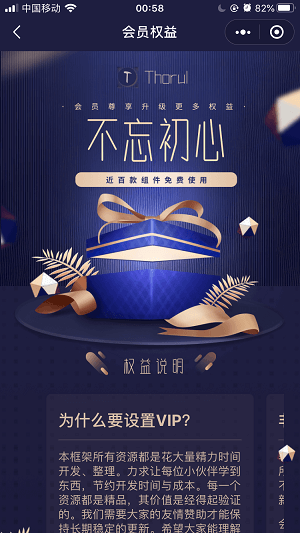 注:自1.4.2版本之后,ThorUI只对uni-app版本进行开源,小程序原生版付费会员才可使用(¥120/永久),1.4.2版本之前不受影响。 如若需要,请联系QQ:3168647172。