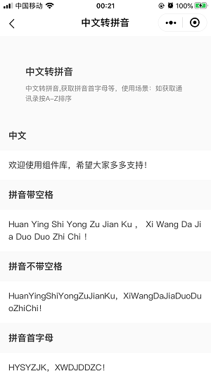 7.新增中文转拼音组件,可处理多音字。
