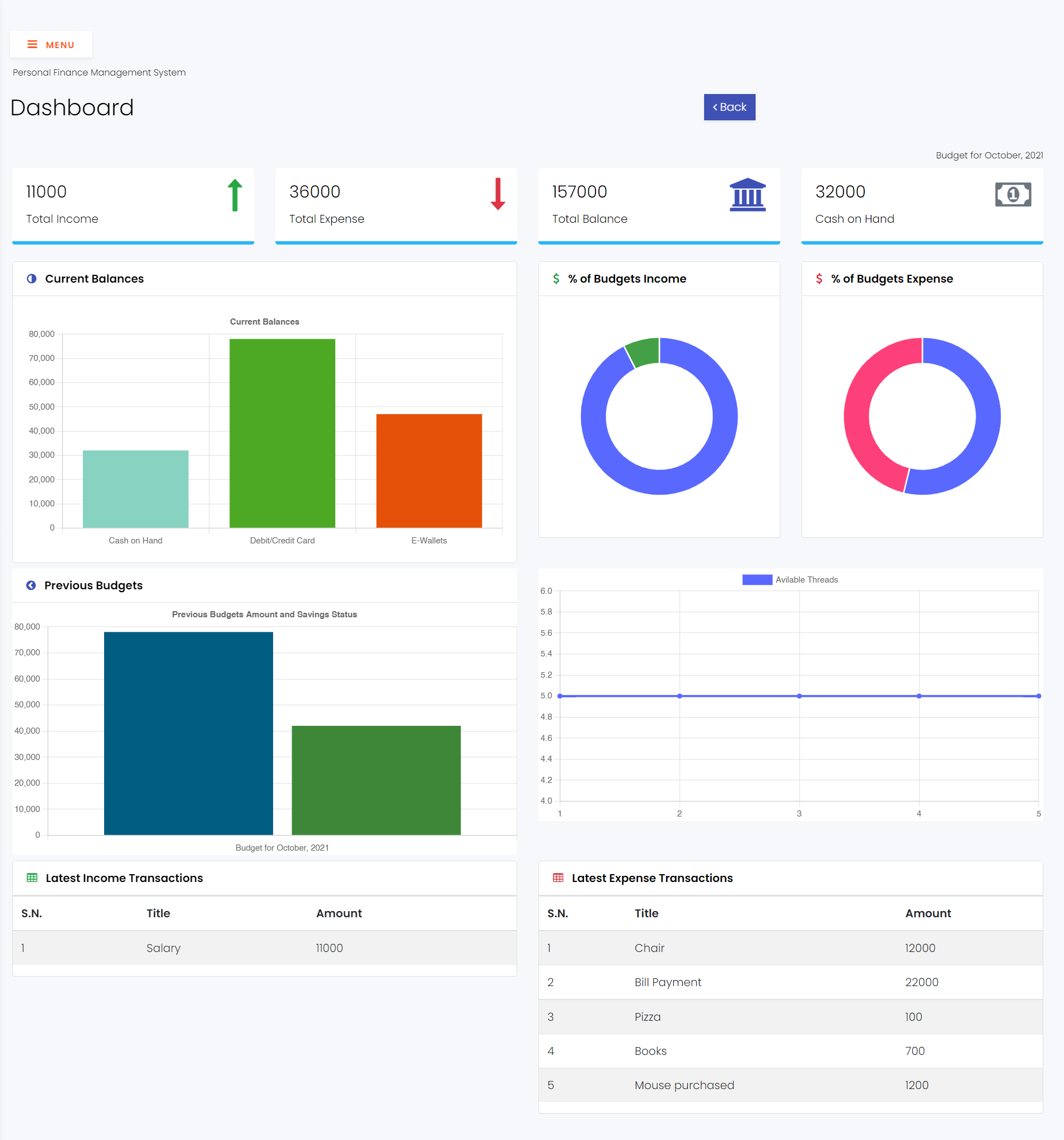 Personal finance is a single-user financial records keeping system. It encourages you to maintain your overspending habits. At first, you have to create an estimated spending amount called a budget for a definite term. After that, it assists you to keep track of how much you have earned and spent within that budget. You can get detailed reports via GUI charts powered by Chart js.