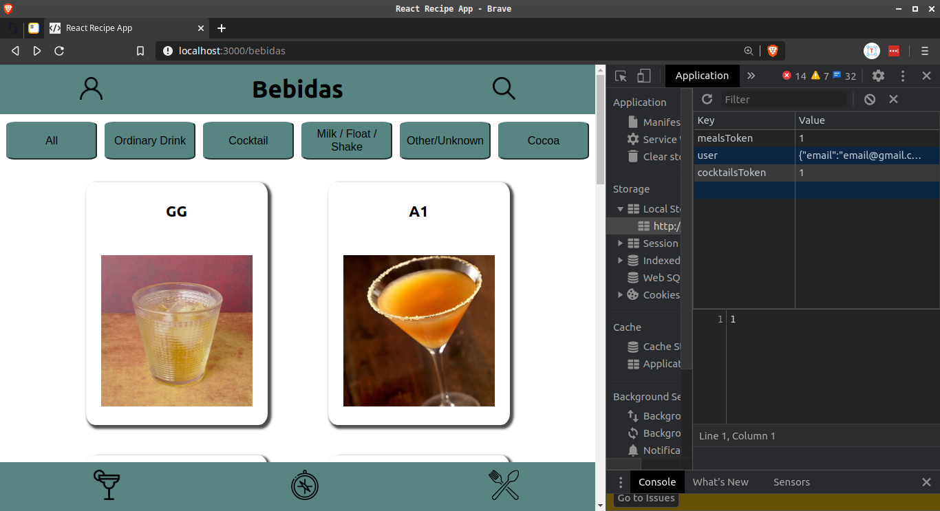 If he clicks on start recipe ("Iniciar Receita"), the ingredient steps changes to checkbox, and those are saved inside this localStorage object to keep the progress in case the user closes the app.