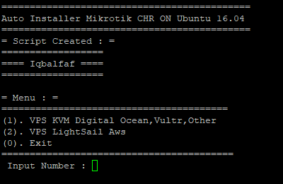 mikrobuntu Install Mikrotik CHR On Ubuntu 16.04 64bit installation apt update && apt upgrade -y wget https://raw.githubusercontent.com/iqbalfaf/mikrobuntu/master/install.sh chmod +x install.sh ./install