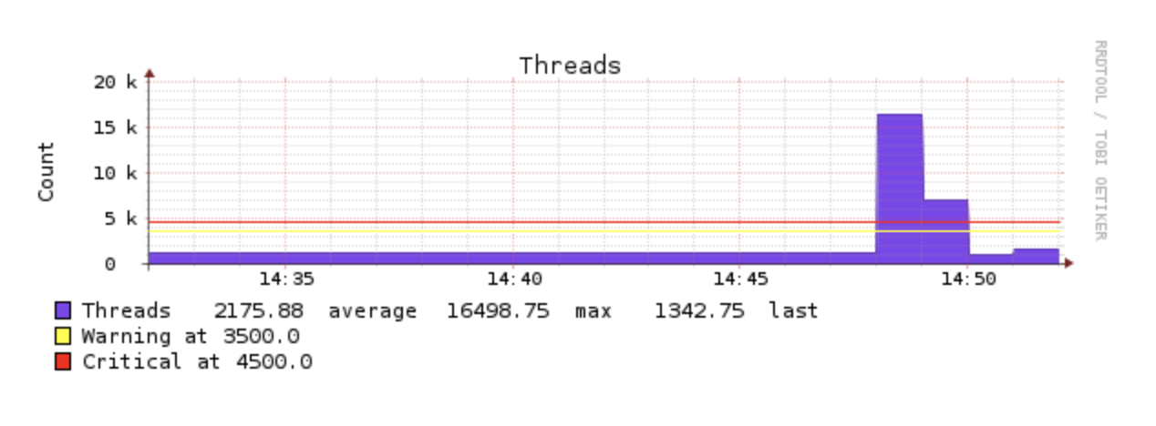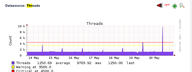 CRIT - Count: 21608 threads (warn/crit at 3500 threads/4500 threads)(!!), Usage: 3.85%