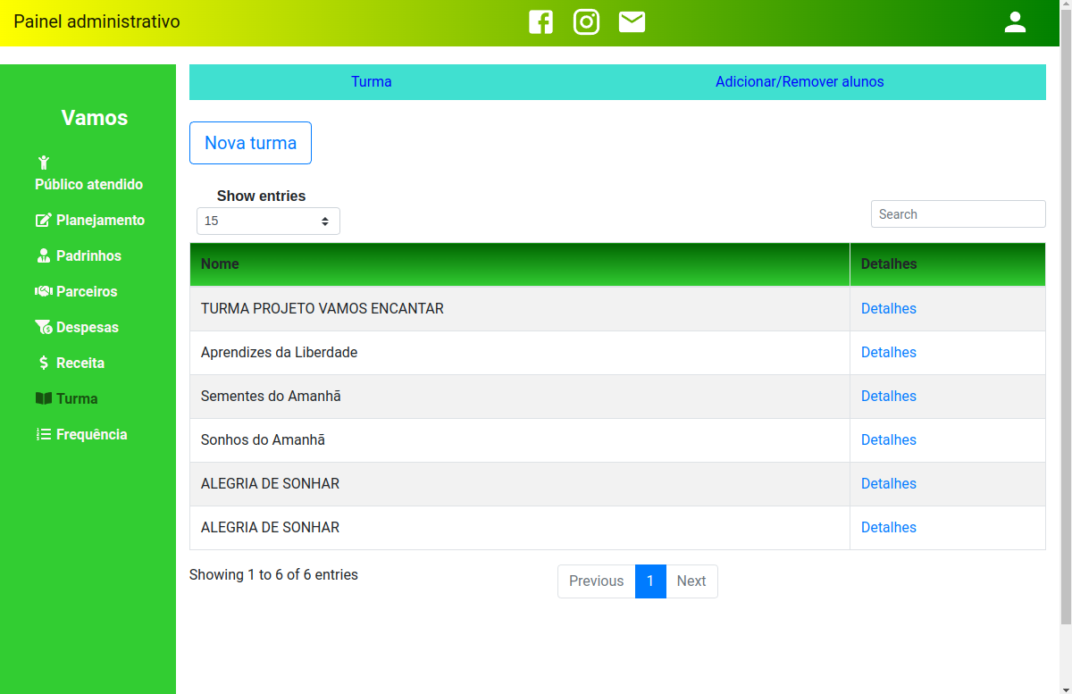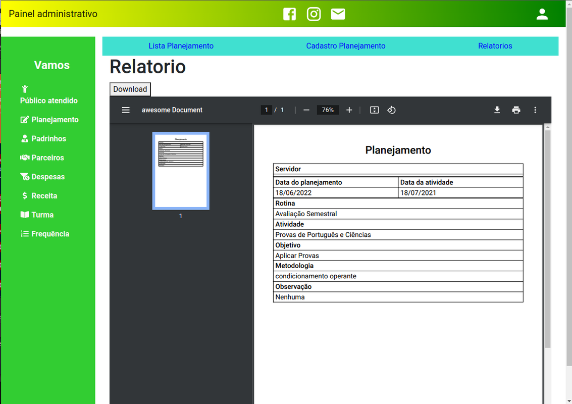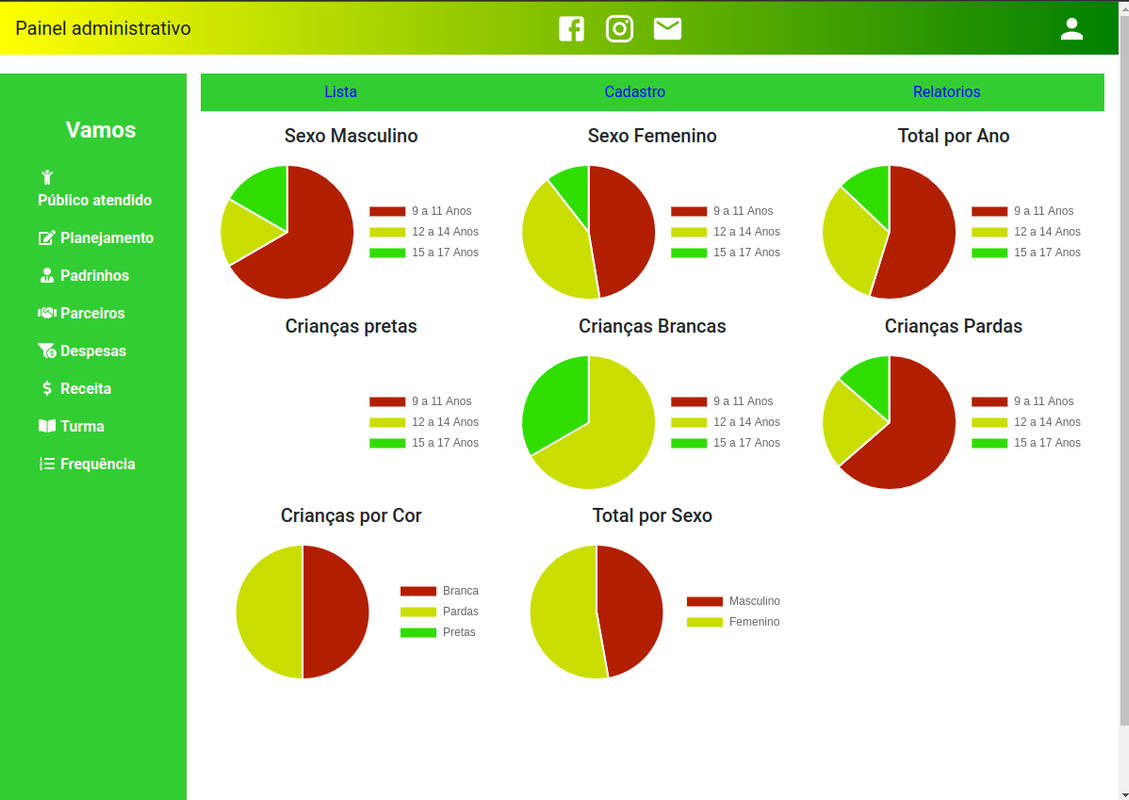 Projeto desenvolvido para automacão dos processos e gerenciamento dados da ONG Associação Vamos para permitir uma maior praticidade na gestão da informação e controle de atividades para o público atendido (crianças e adolescentes). O sistema permite que o gestores possam monitorar o desempenho da organização e manter o controle sobre as ações efetuadas em cada domínio, e assim montar estratégias mais eficientes para apoiar a assistência social.