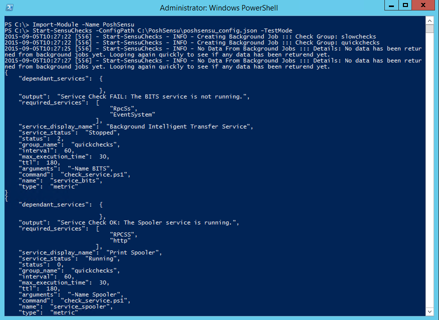 Start-SensuChecks -ConfigPath 'C:\PoshSensu\poshsensu_config.json' -TestModeYou should see some JSON output of the script starting and the checks returning, which should look similar to this: