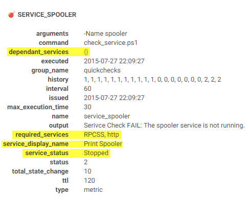 The check can also return key/value which will get sent to the Sensu client. This is handy for providing some more details on the check, for example in the check_service.ps1 check, I am also retrieving DisplayName, DependentServices, RequiredServices and Status properties from the service object in PowerShell and returning them. These details show up when the check has a problem: