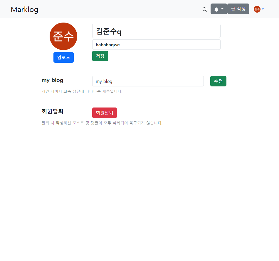 사용자의 이미지, 이름, 소개, 블로그 이름, 회원탈퇴를 할 수 있습니다.