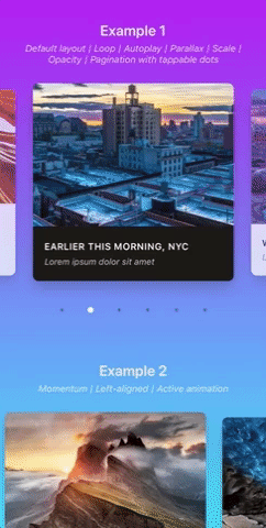 Swiper/carousel component for React Native featuring previews, multiple layouts, parallax images, performant handling of huge numbers of items, and more. Compatible with Android & iOS.