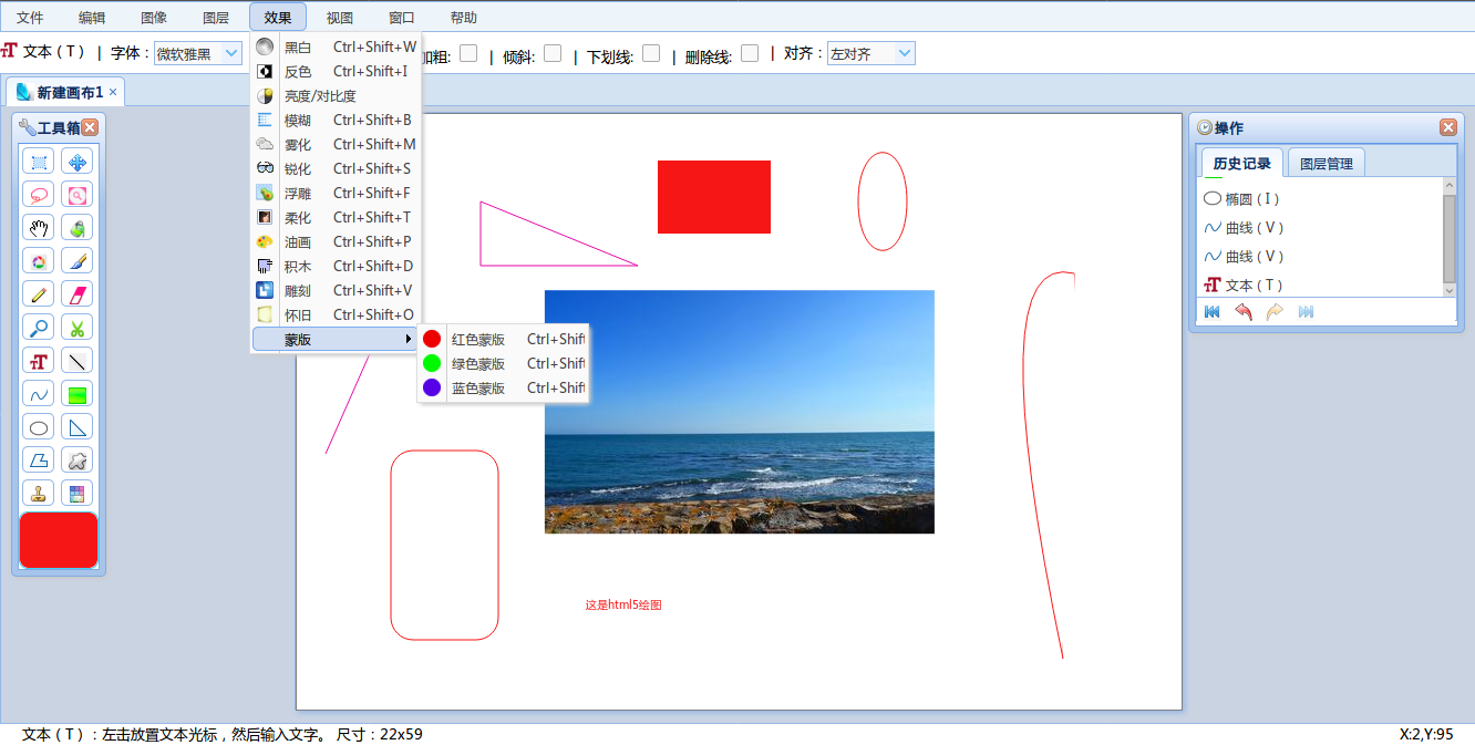 - 能够实现的效果有:黑白、模糊、亮度/透明度、反色、雾化、锐化、浮雕、雕刻、柔化、油画、积木、怀旧、蒙版.