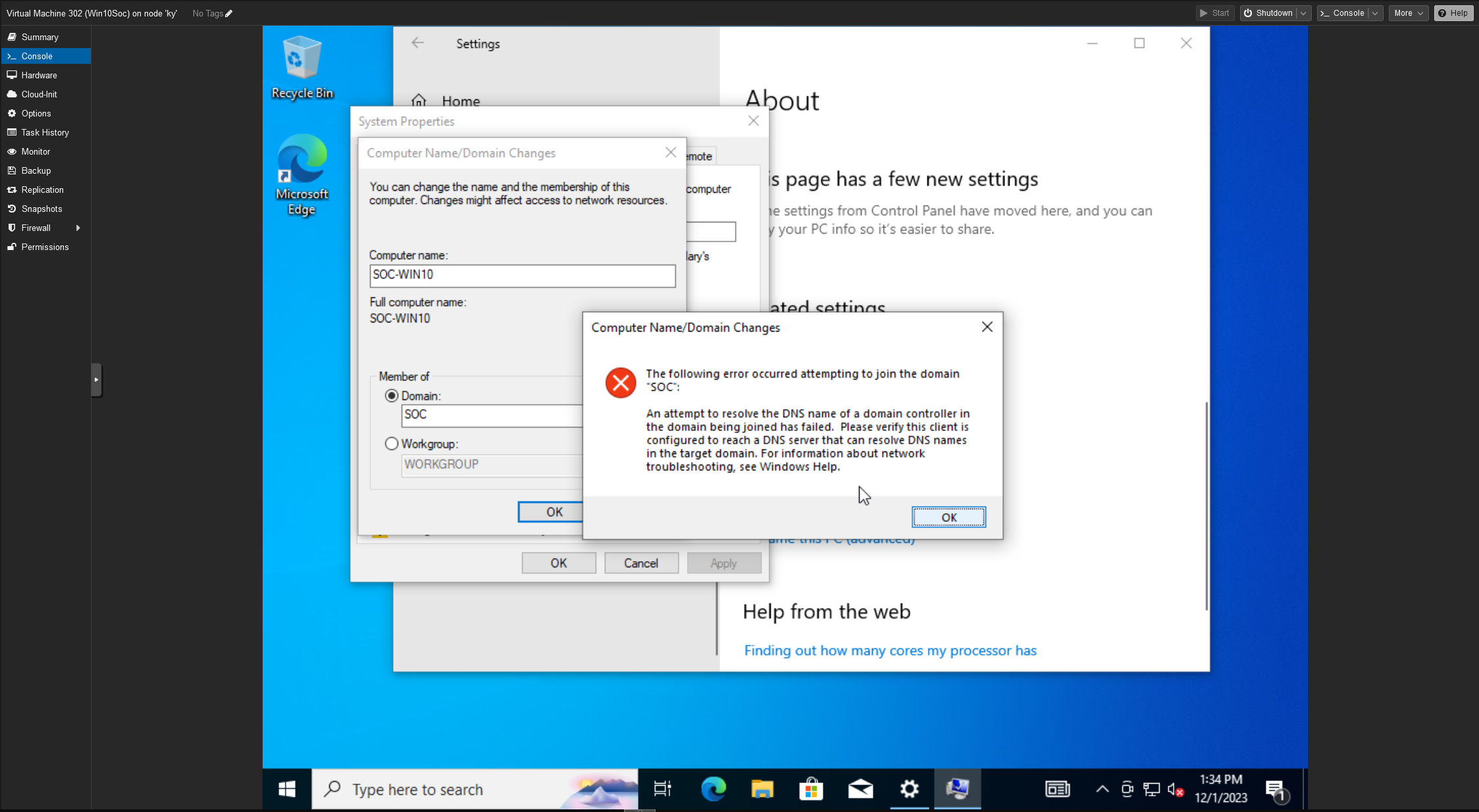 - Went to Settings > System > About > Rename this PC (advanced) > Computer Name > Change (Domain) > Member of Domain: soc