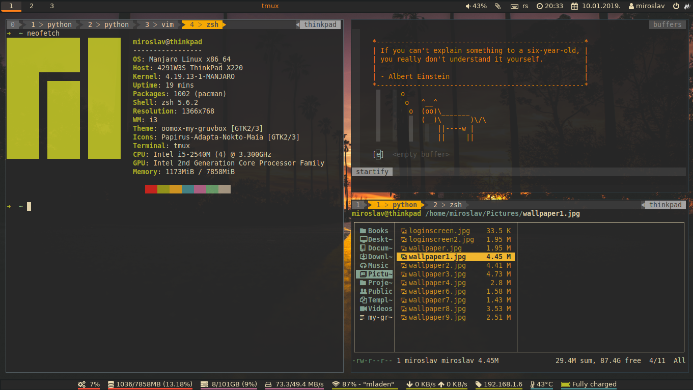 My i3wm configuration files inspired by Gruvbox colorscheme for Vim. This configuration assumes a fresh install of the i3 community distribution of Manjaro, but might work on other Linux distributions (not tested).