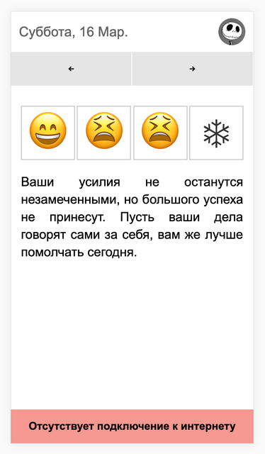 Приложение показывает предсказание на день. Чтобы увидеть предсказание, нужно раскрыть четыре эмодзи-карточки. Предсказание можно получить как на сегодня, так и на любой другой день, для перемещения по дням используйте стрелки в верхней части.