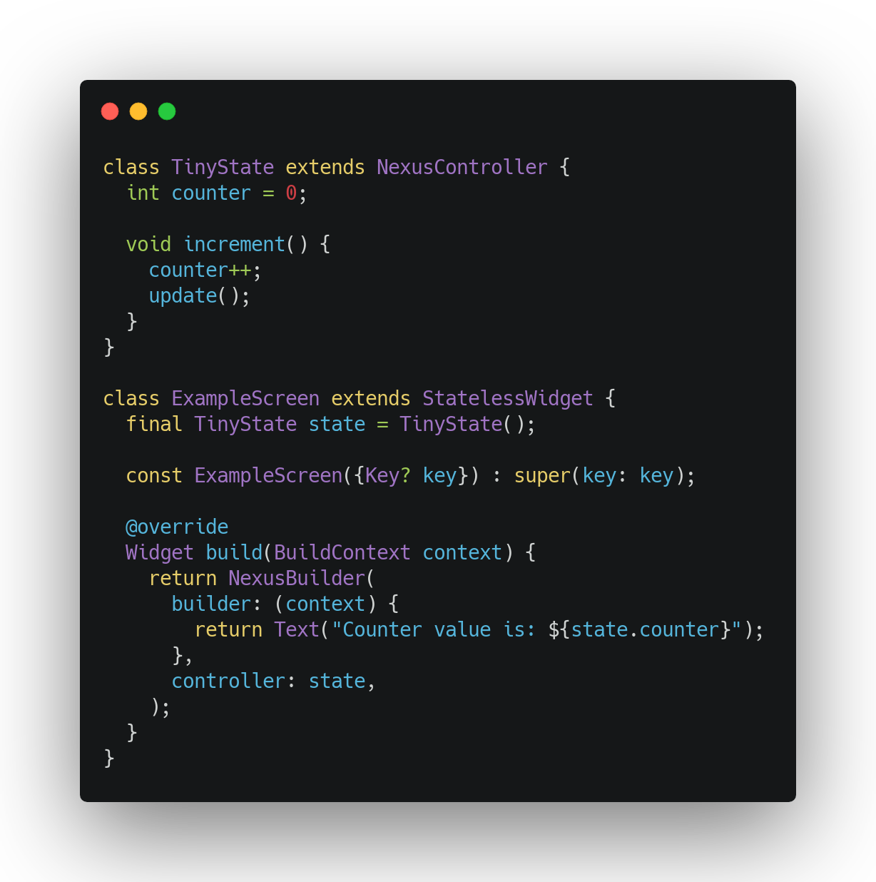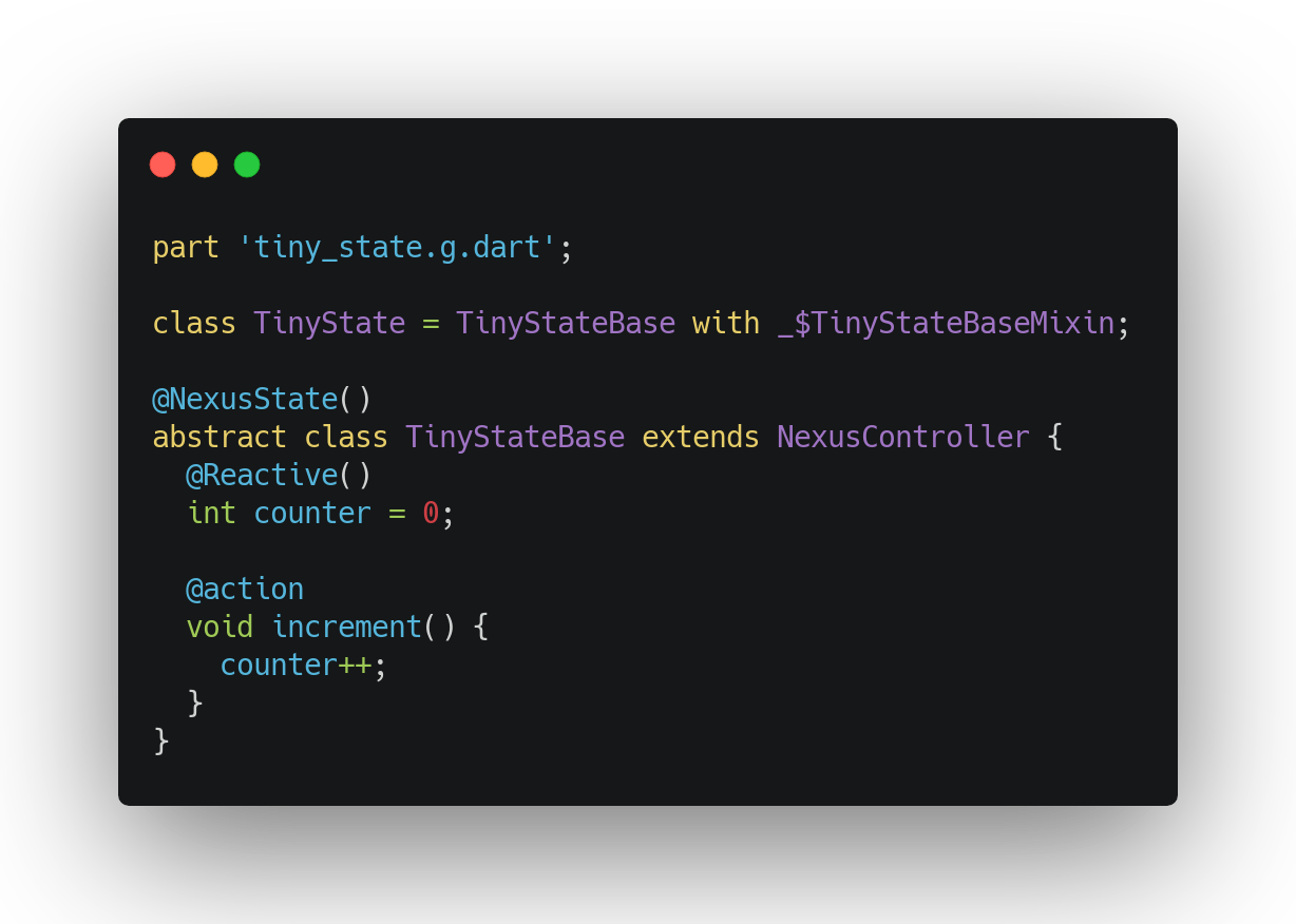 Nexus is a state management library that makes it easy to create and consume your application's reactive data to the user interface. With nexus_codegen, wiring becoming fully automatic and feels very natural. As an application developer, you focus solely on what reactive data should be consumed in the UI (and elsewhere) without worrying about keeping it in sync.
