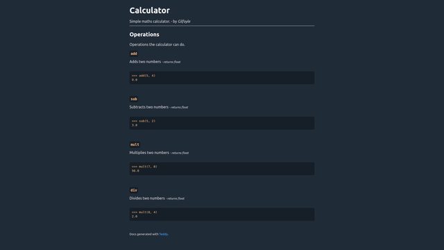 doc = Teddy("Calculator", "Simple maths calculator.", "Gilfoyle")