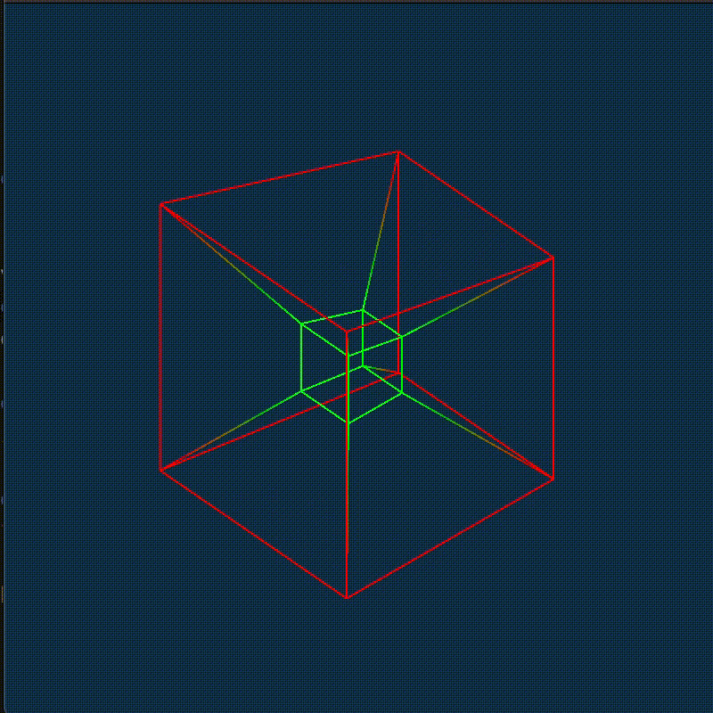 Example: A 4d-3d perspectively projected and 3d-2d orthographically projected tesseract rotating about the zw-plane (the code for this can be seen in hypercube.cpp):