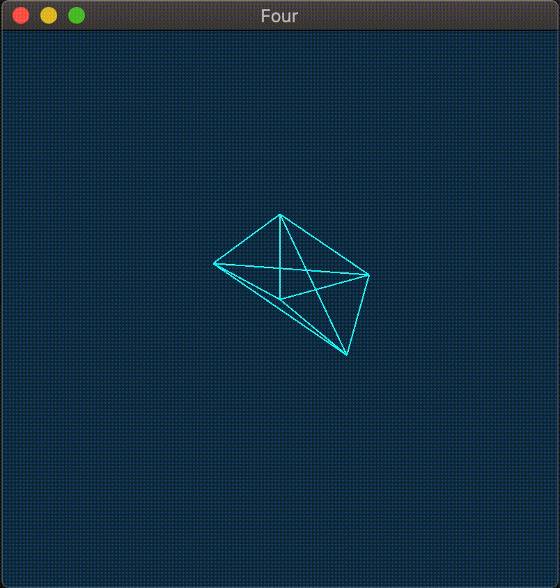 Example: An orthographically projected pentachoron (5-cell) rotating about the yw-plane (the code for this can be seen in pchoron.cpp):