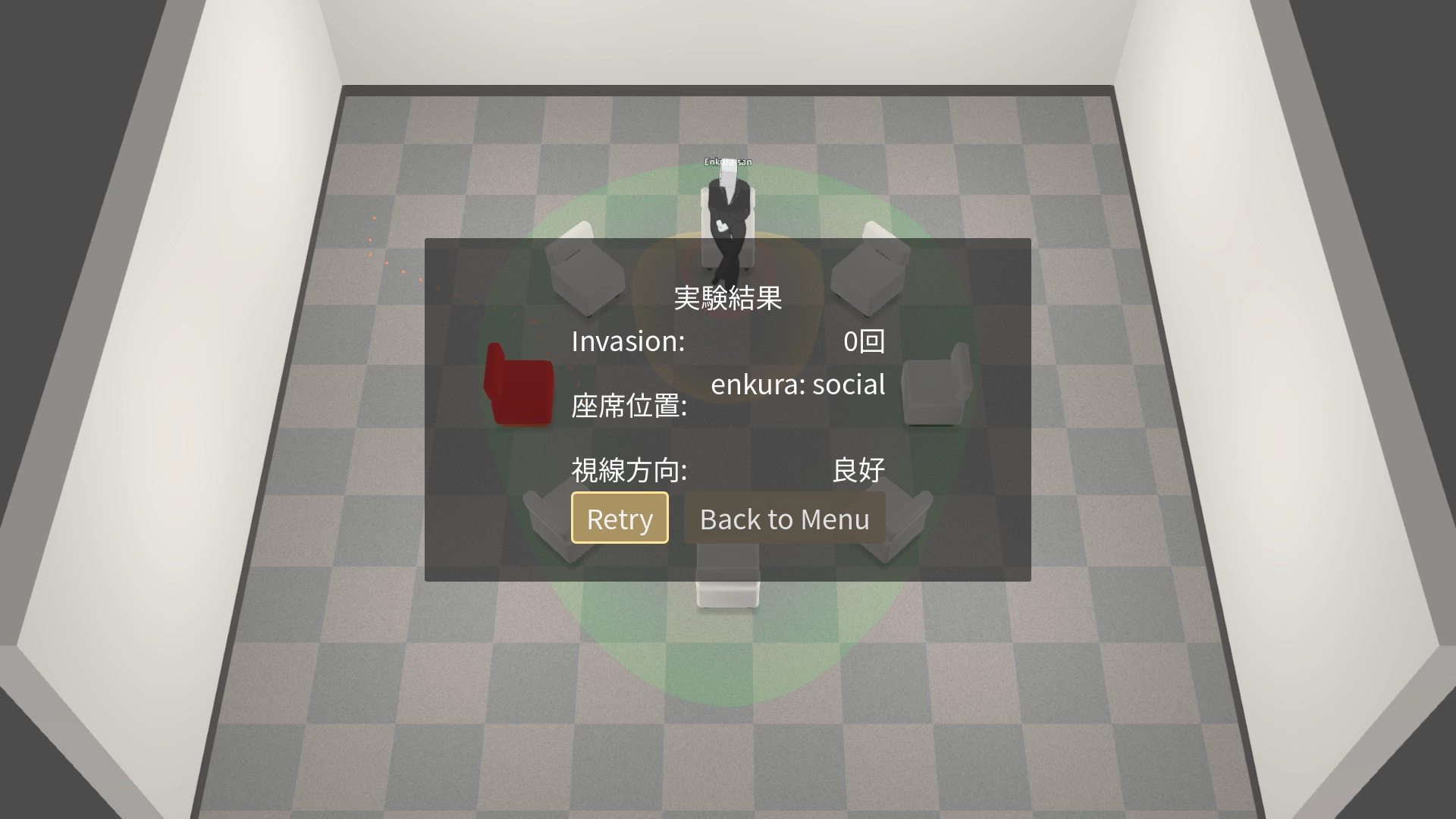 SeatScape VRは、パーソナルスペース研究をVR空間上で行うことを目的に開発された実験支援ツールです。