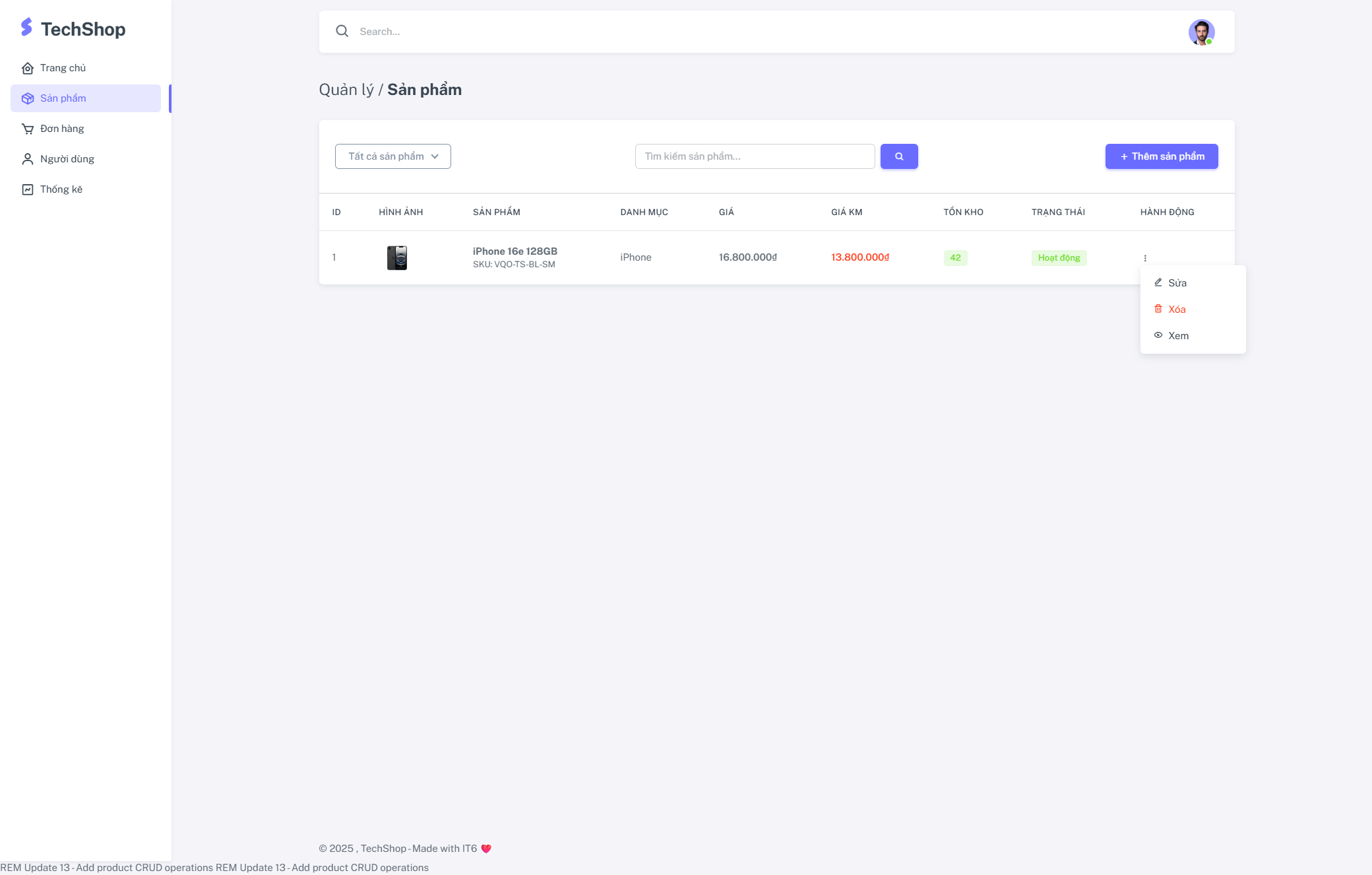 - Danh sách sản phẩm với bộ lọc và tìm kiếm