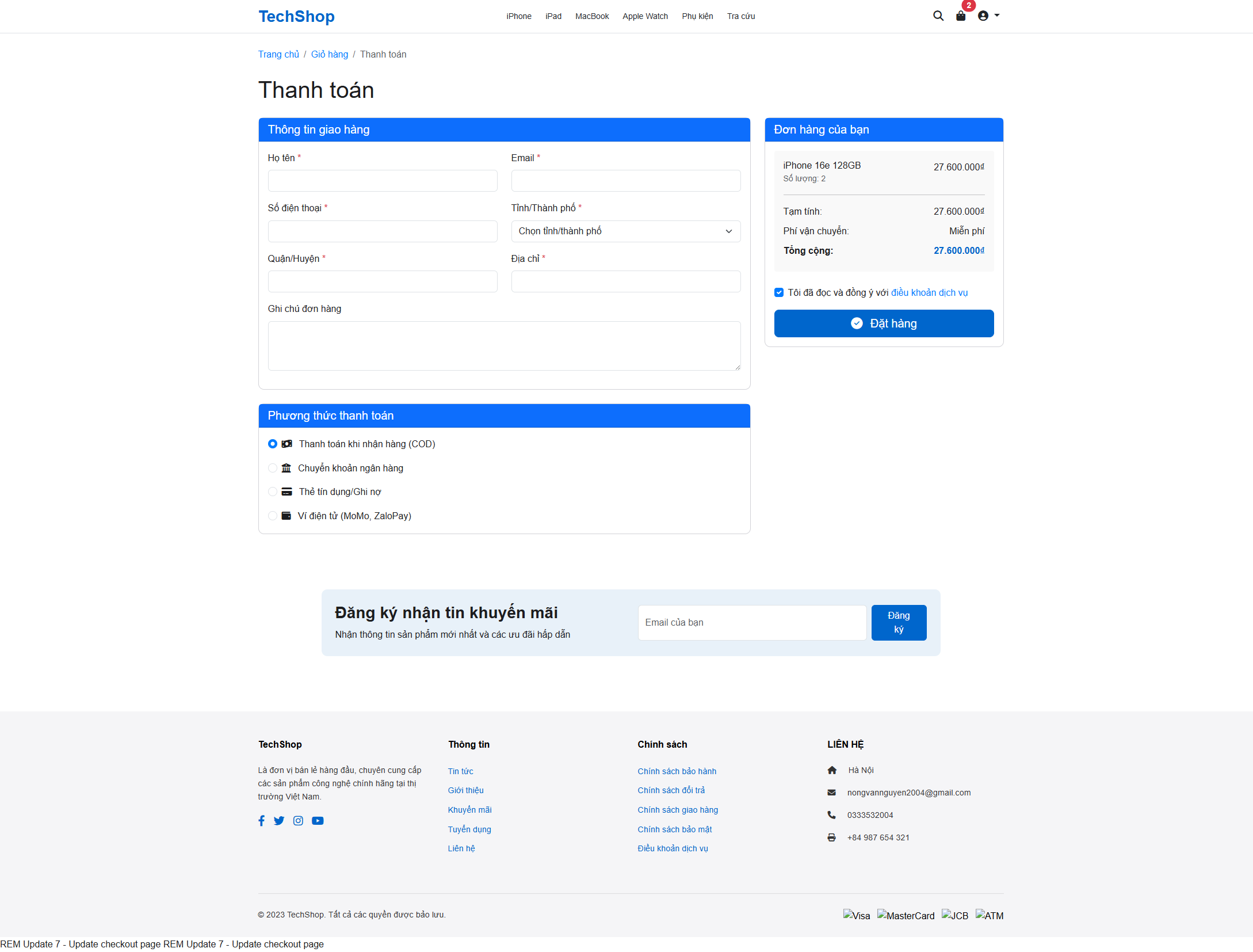 - Hệ thống đặt hàng - Checkout với thông tin giao hàng và thanh toán
